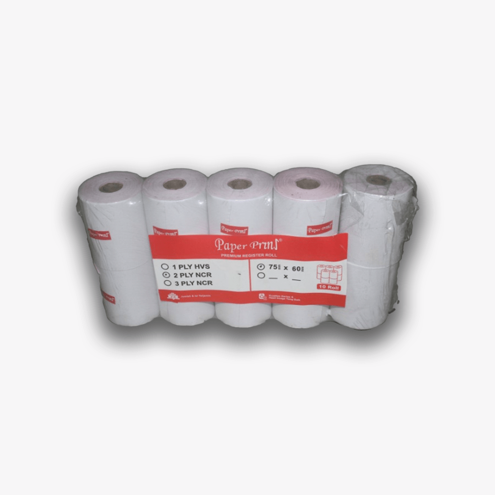 Paperpryns Register Roll Struk Strook Roll NCR (75mm × 60mm) / 2PLY adalah solusi cetak struk dan nota dengan ketepatan ganda. Kertas NCR berkualitas tinggi memberikan cetakan yang jelas dan tahan lama tanpa memerlukan karbon.